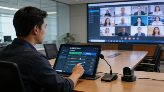 同步补偿设置:部分专业会议终端支持“音画同步调节”功能,若明确声音滞后画面,可手动增加音频延迟补偿(如调整至200ms),使两者达到同步。