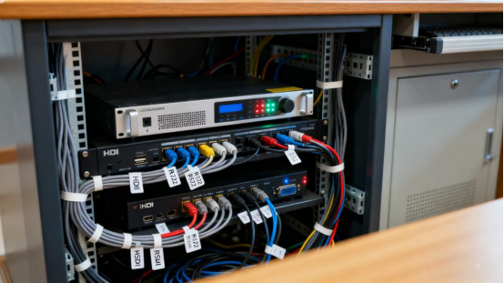 • 线缆选型:视频信号(如 HDMI)采用带屏蔽层的 HDMI 线(如 HDMI 2.1 屏蔽线),音频信号采用双绞屏蔽线(如 RVVP 线缆),控制信号(如 RS232)采用专用的控制线缆 —— 屏蔽层可有效隔绝外界电磁干扰(如教室中的日光灯、空调的电磁辐射),避免信号失真。